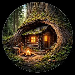 • Hidden cabin inside tree trunks