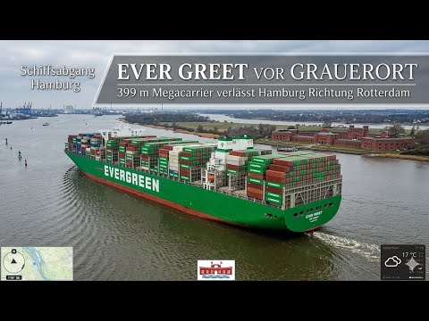 Der gewaltige Containerfrachter EVER GREET passiert aktuell die ElbCam bei Grauerort und ist auf dem Weg von Hamburg nach Rotterdam. 🚢