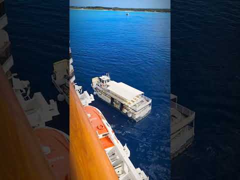 Since ships anchor offshore here, small tender boats shuttle passengers between the ship and the island β part of the adventure of visiting this beach paradise.