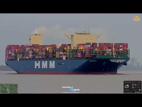 Der 2020 gebaute Container-Riese der südkoreanischen Reederei HMM ist teilbeladen unterwegs und hat einen aktuellen Tiefgang von 12 Metern.