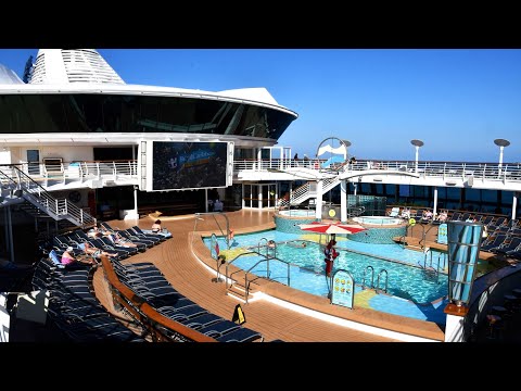 Let's start on Deck 12 on the Starboard Side on the Jogging Track. We'll come around the Bow of the Ship and down the Port Side. We will look down into the Lido Deck on Deck 11, where the Main Pool is. We get back on the Starboard Side and get to Adventure Beach, the kids' splash area. We go past Izumi and around the Aft of the Ship. We go past the Shuffleboard Board and the Challenger's Arcade before heading up to Deck 13 to see the Miniature Golf Course and the Rock Climbing Wall. We head back down to Deck 12 (Not 11!) and view the Pool Deck once again. We then head down to Deck 11, and enter the Solarium which is at the Front of the Ship! And then up into the Fitness Center. And now up on Deck 13 the Sun Deck where we will end the tour.