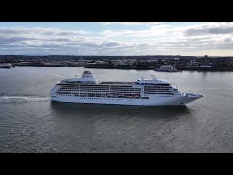 Regent Cruise ship Seven Seas Mariner leaving Liverpool for Cork. She is a Passenger Ship and is sailing under the flag of Bahamas. Her length overall is 216 meters and her width is 28.84 meters and her call sign is C6VV8.