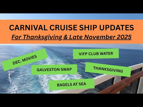 Carnival Cruise News updates including the December 2025 Dive In Movies, VIFP Club bottled water benefit update, a new complimentary bagel eatery coming to ships soon, Thanksgiving activities, and a Galveston ship swap!