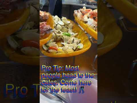 We’re showing off the massive seafood spread available right when you board—from chilled shrimp and crab legs to fresh mussels and paella. Avoid the crowds at the smaller cafes and start your vacation with a feast!